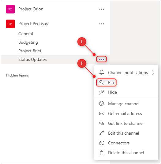 Om belangrijkste kanalen zichtbaar de hele tijd te houden, kunt u ze vastmaken aan de bovenkant van de zijbalk. Klik op het pictogram met drie stippen naast het team en selecteer “PIN” in het menu.