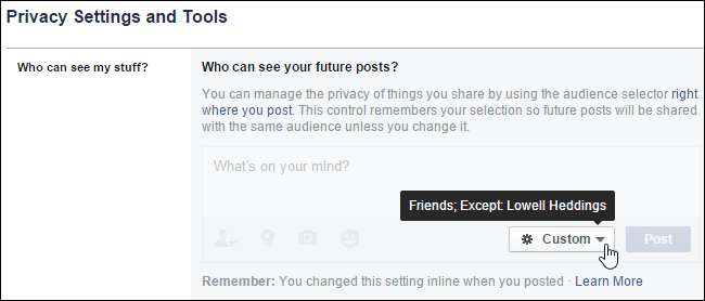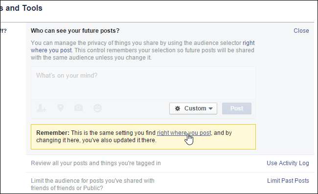 Wanneer u terugkeert naar het scherm "Privacyinstellingen en -tools", wordt een veld "Onthouden" weergegeven met de mededeling dat de instelling die u zojuist hebt gewijzigd dezelfde is die u kunt wijzigen waar u een bericht plaatst, en dat u deze bij de post hebt bijgewerkt als goed.