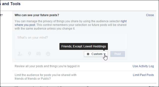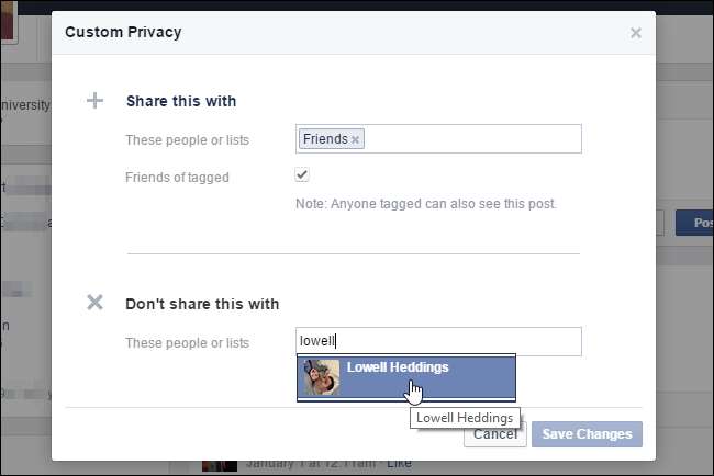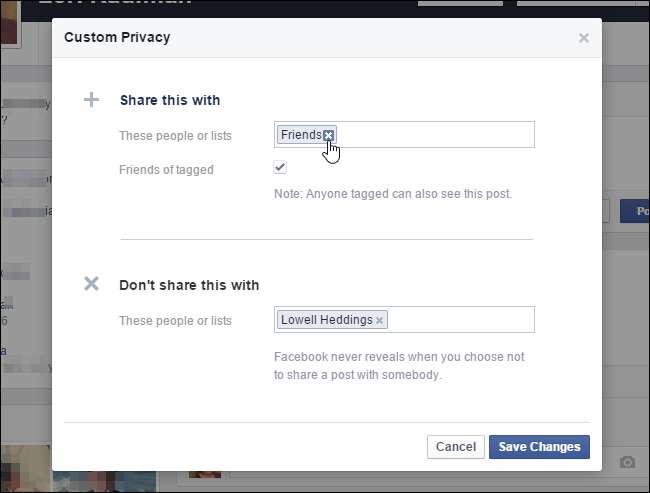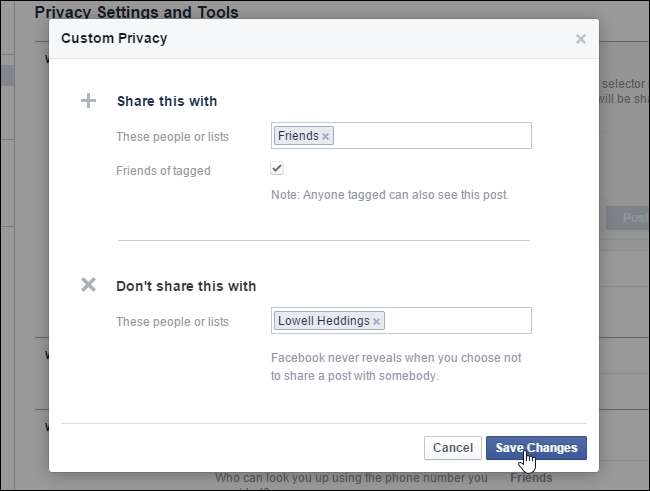 Het dialoogvenster "Aangepaste privacy" wordt weergegeven, net zoals wanneer u op de knop "Vrienden" klikte, zoals eerder in dit artikel besproken. Breng de gewenste wijzigingen aan en klik op 'Wijzigingen opslaan'. Deze instellingen worden toegepast op alle toekomstige berichten.