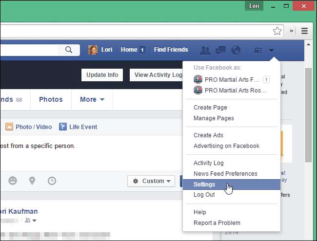 Je kunt deze instelling ook wijzigen voor alle toekomstige berichten. Misschien wilt u dit doen als er een persoon is die u niet wilt 'ontvriend' maken, maar u niet wilt dat hij uw berichten te zien krijgt. Klik op de pijl-omlaag aan de rechterkant van de bovenste blauwe balk op je Facebook-pagina. Selecteer "Instellingen" in het vervolgkeuzemenu.