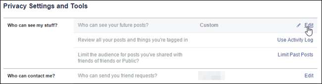 Het scherm "Privacyinstellingen en tools" wordt weergegeven. In het gedeelte 'Wie kan mijn spullen zien?' sectie, klik op 'Bewerken' rechts van 'Wie kan toekomstige berichten zien?'