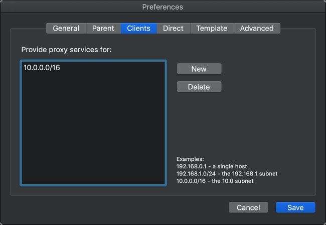 U moet een reeks IP-adressen toevoegen die gebruik kunnen maken van uw nieuwe proxy. Als uw IP-adres in de vorige stap eruitziet als "192.168.0.X", dan kunt u op nieuw klikken en "192.168.0.0/24" typen om het voor het hele bereik in te schakelen. Als uw IP-adres lijkt op "10.0.0.X", dan kunt u "10.0.0.0/16" typen om het hele bereik in te schakelen.