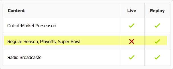 Lijkt me een goede deal totdat je naar de details kijkt. Je kunt niet echt live wedstrijden van het reguliere seizoen bekijken. In plaats daarvan moet je wachten tot ze voorbij zijn en hun herhaling bekijken.