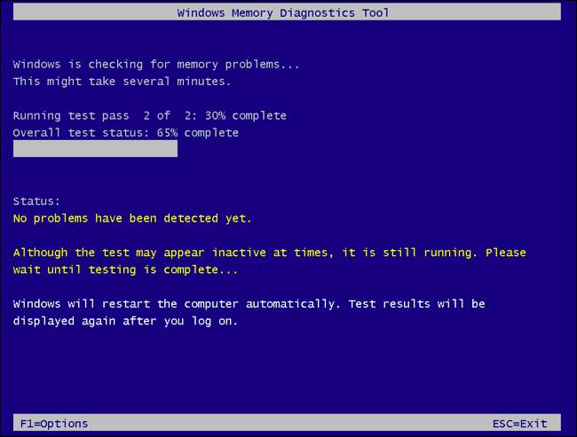 Uw computer zal opnieuw opstarten en het scherm Windows Memory Diagnostics Tool zal verschijnen. Laat het gewoon zijn en laat het de test uitvoeren. Dit kan enkele minuten duren. Tijdens dit proces ziet u een voortgangsbalk en een 'Status'-bericht zal u informeren als er tijdens het proces problemen zijn gedetecteerd.