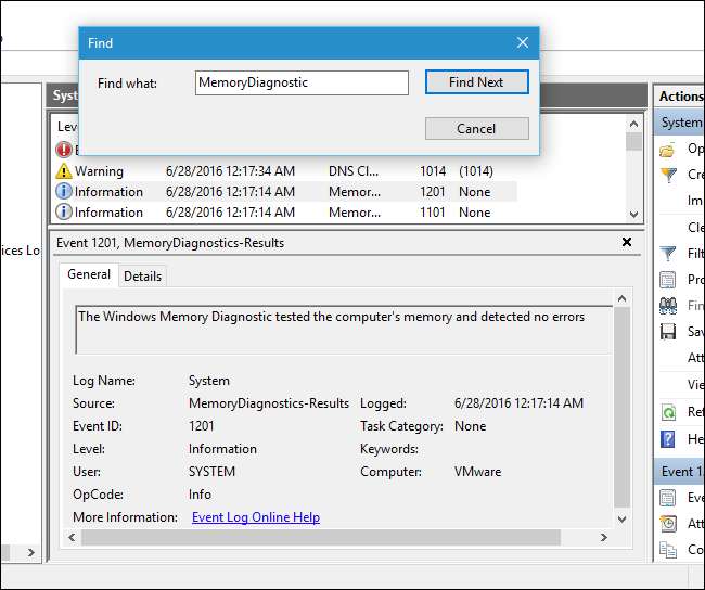 Typ "MemoryDiagnostic" in het zoekvak en klik op "Volgende zoeken". U ziet het resultaat onder aan het venster.