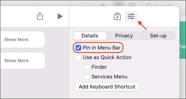Klik nu op de pictogram "Snelkoppelingsgegevens" in de rechterbovenhoek van het scherm en vink de "PIN IN MENUBAR" in het tabblad "Details".