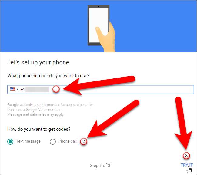 Google laat ons telefonische verificatie instellen, ook al gebruiken we de app. Het telefoonnummer dat we nu invoeren, wordt later ons reservetelefoonnummer. U kunt de code ontvangen via een sms of telefoontje. Klik op "Probeer het" om een code naar uw telefoon te sturen.