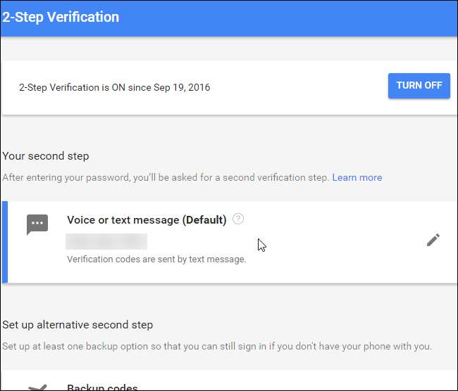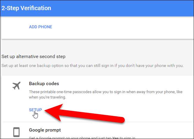 Google biedt afdrukbare back-upcodes waarmee u kunt inloggen, zelfs als u de toegang verliest tot zowel uw mobiele applicatie als uw back-uptelefoonnummer. Om deze codes in te stellen, klikt u op “Instellingen” onder Back-upcodes in het gedeelte Alternatieve tweede stap instellen.