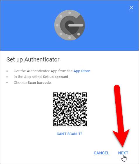 Het scherm "Authenticator instellen" wordt weergegeven met een QR-code of streepjescode. We moeten dit scannen met de Google Authenticator-app ...