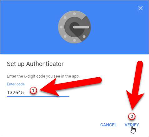 Voer de code van de Authenticator-app in het dialoogvenster Authenticator instellen in en klik op "Verifiëren".