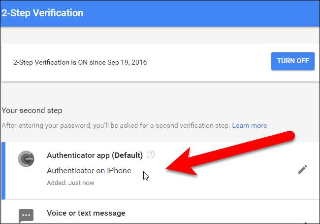 De Authenticator-app wordt toegevoegd aan de lijst met tweede verificatiestappen en wordt de standaard app.