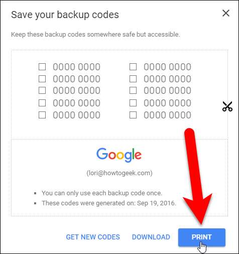 Het dialoogvenster Uw back-upcodes opslaan wordt weergegeven met een lijst van 10 back-upcodes. Druk ze af en bewaar ze op een veilige plaats. Als u alle drie de verificatiemethoden (uw wachtwoord, verificatiecodes op uw telefoon en back-upcodes) kwijtraakt, wordt de toegang tot uw Google-account geblokkeerd. Elke back-upcode kan slechts één keer worden gebruikt.
