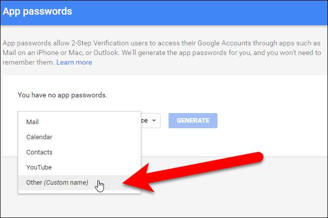 On the App passwords screen, click the “Select app” drop-down list.