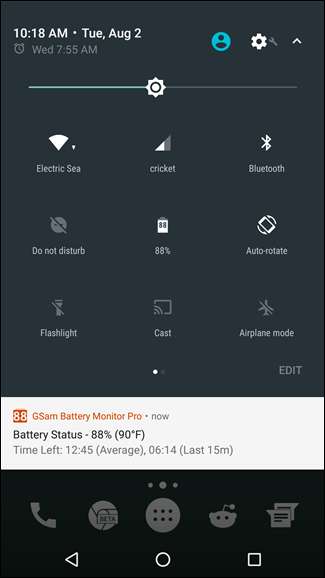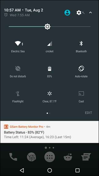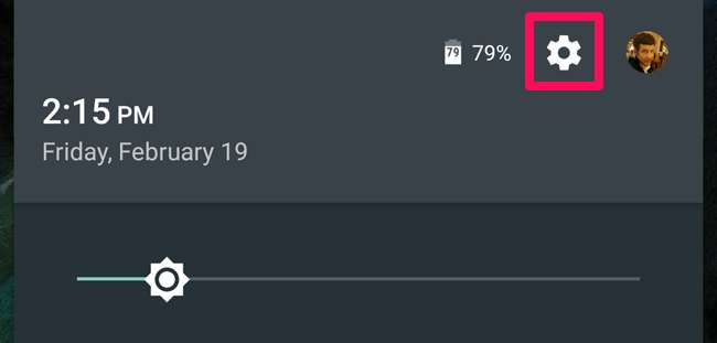 Als je Android Marshmallow gebruikt, heb je een iets minder krachtige versie van deze aanpassing verborgen achter een geheim menu. Om de System UI Tuner in te schakelen, trekt u het meldingenpaneel boven aan het scherm van uw Android-smartphone of -tablet omlaag. Druk lang op het tandwielpictogram dat verschijnt tussen de batterij-indicator en je profielafbeelding.