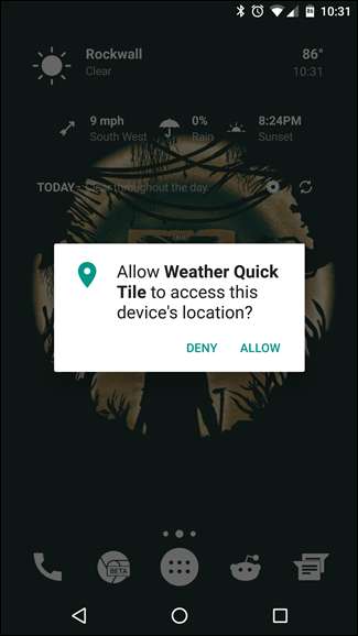 Deze specifieke app laadt eerst niets. Je moet erop tikken en hem toegang geven tot de locatie van het apparaat. Zodra dat is gebeurd, wordt het weer opnieuw geladen door op het pictogram te tikken en door te dubbeltikken worden de instellingen van Weather Quick Tile geopend.