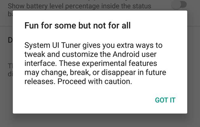 Open het scherm System UI Tuner en Google waarschuwt u dat deze opties 'leuk zijn voor sommigen, maar niet voor iedereen'. Zoals Google het stelt: “deze experimentele functies kunnen in toekomstige releases veranderen, breken of verdwijnen. Ga voorzichtig verder." Tik op "Begrepen" om door te gaan.