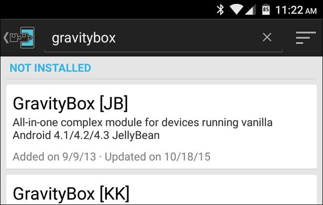 Als je Xposed helemaal hebt ingesteld, open je de Xposed Installer-app en tik je op de knop Downloaden. Tik op het zoekpictogram en zoek naar "GravityBox". U wilt GravityBox downloaden voor uw versie van Android, dus zorg ervoor dat u de juiste selecteert ("GravityBox [MM]" voor Marshmallow, "GravityBox [LP]" voor Lollipop, enzovoort).