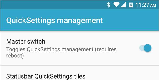 Open na het opnieuw opstarten de nieuwe GravityBox-app die in uw app-lade verschijnt. Er zitten hier veel tweaks in, en ik raad ten zeerste aan om ze door te kijken, maar op dit moment willen we het menu Snelle instellingen aanpassen, dus ga naar Statusbar Tweaks> QuickSettings Management. Tik op het item "Hoofdschakelaar" om QuickSettings in te schakelen. U moet uw telefoon opnieuw opstarten voordat u doorgaat.