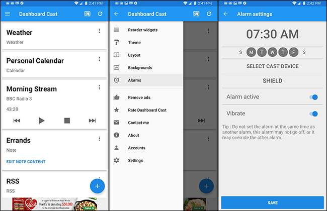De coolste functie in Dashboard Cast is de mogelijkheid om automatisch naar een televisie te casten op basis van een alarm. Tik in de kolom met instellingen aan de linkerkant op de optie "Alarm" en stel de tijd in waarop je 's ochtends wakker wordt. De app begint op het afgesproken tijdstip met casten. Als je televisie is ingesteld op automatisch inschakelen wanneer hij de juiste invoer ontvangt, wacht hij op je, net als je koffiezetapparaat.