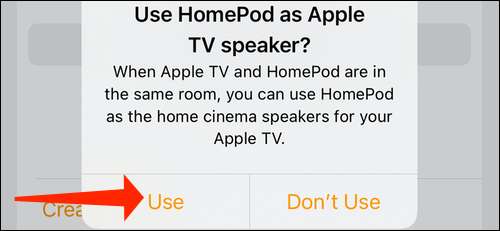 De Home-app vraagt of u de startpod wilt gebruiken als de luidspreker voor uw Apple TV 4K. Tik op "Gebruik".