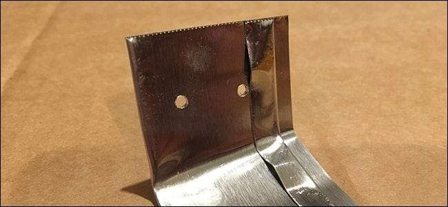 Het aluminium gootstuk (hierboven afgebeeld) komt in een L-vorm als je het koopt, maar het is buigzaam genoeg dat je het allemaal in een plat stuk kunt buigen met lichte tikjes met een hamer. Het is een van de redenen waarom we hiervoor aluminium gebruiken: het is erg zacht en kan gemakkelijk naar uw wil buigen, waardoor de meeste aanpasbaarheid mogelijk is. Het is ook niet-magnetisch, dus het interfereert niet met de sensor.