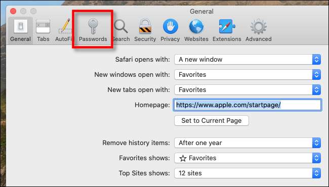 Er verschijnt een voorkeurenvenster met een rij pictogrammen die over de bovenkant zijn uitgerekt. Klik op het pictogram "Wachtwoorden", dat eruitziet als een sleutel.
