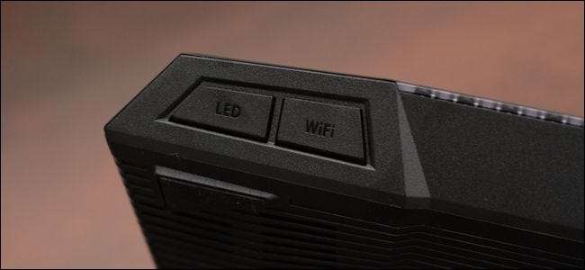 Met de knoppen kunt u de indicator-LED's en Wi-Fi uitschakelen. Hoewel de meeste mensen hun wifi-radio's niet met welke frequentie dan ook handmatig zullen uitschakelen, is de LED-schakelaar best handig. De LED-indicatoren op de RT-AC87U zijn blauw en vrij subtiel, maar het is nog steeds erg handig om ze uit te schakelen als je ze niet nodig hebt (vooral als je niet wilt dat ze midden in de nacht door de woonkamer schijnen) .