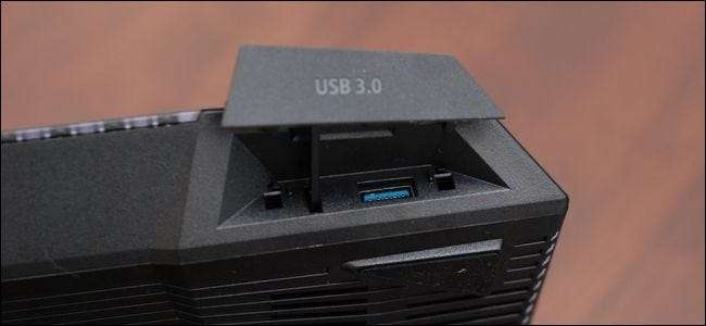 Aan de rechter voorkant van de router zit een USB 3.0 poort verborgen onder een klein klepje. Dit is de enige USB 3.0-poort op het apparaat en wanneer deze niet wordt gebruikt, verdwijnt deze volledig in de behuizing van de router wanneer de klep wordt gesloten.