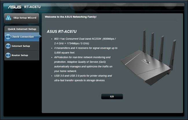 Het opzetten is een arena waar routerfabrikanten eindelijk hun spullen bij elkaar hebben en allemaal, redelijk consistent, schitteren. De grote fabrikanten hebben echt geweldig werk geleverd door weg te komen van het "u kunt beter de handleiding lezen" configuratieproces van weleer en zijn overgegaan op een eenvoudige begeleide wizardconfiguratie. ASUS is niet alleen geen uitzondering op die trend, maar hun installatiewizard is dat wel. doodeenvoudig te gebruiken.