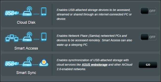 Met het AiCloud-systeem kunt u verbinding maken met shares op uw lokale netwerk (en zelfs een Wake-on-LAN-pakket verzenden om computers in slaapstand waartoe u toegang wilt te wekken). U kunt ook via USB aangesloten opslag synchroniseren met de cloudopslag van ASUS (of andere cloudproviders die het protocol ondersteunen).