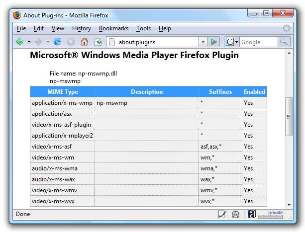 En je zou de Windows Media Player-plug-in in de lijst moeten zien. U kunt ook zien op welke bestandstypen Firefox de plug-in zal gebruiken.