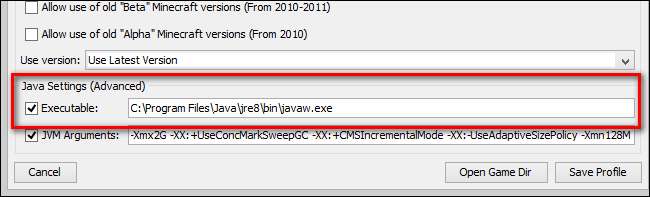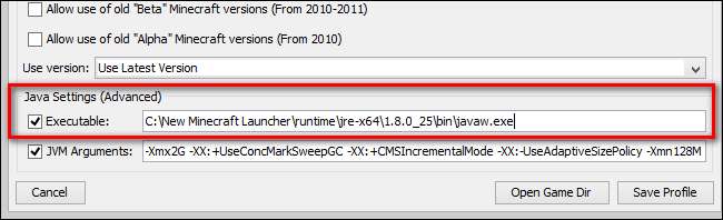 Zoek in het profielmenu onderaan naar "Java-instellingen (geavanceerd)". U zult opmerken dat het momenteel verwijst naar de systeembrede Java-installatie in de bovenstaande schermafbeelding (en u ziet waarschijnlijk een bijna identiek mappad in uw eigen profiel). Zoals hierboven vermeld, wordt het nieuwe opstartprogramma nog niet automatisch standaard ingesteld op het zelfstandige exemplaar.