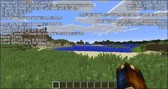 Toen we overschakelden naar de enigszins bijgewerkte zelfstandige Java-instantie die werd gedownload door het Minecraft-opstartprogramma en op dezelfde plek inactief bleef, steeg onze FPS naar 70 (wat de vsync-instelling is die we hebben ingesteld voor onze specifieke monitor). Al met al een verrassende verschuiving in prestaties voor wat (op onze testmachine) een vrij kleine verandering was. Spelers die 32-bits Java 7 gebruiken en upgraden naar 64-bits Java 8 zouden aanzienlijke verbeteringen moeten zien.