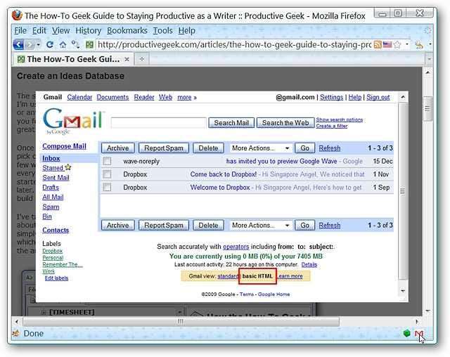 Zodra we op het statusbalkpictogram klikten, ging Gmail meteen open. Als u het "Pop-upvenster" gebruikt, betekent dit dat u uw account in "Basic HTML-indeling" moet bekijken, maar als u een belangrijke e-mail moet verzenden, doet het ontbreken van een "aangepast thema" er niet echt toe. U kunt zoals gewoonlijk door uw account navigeren en de "gearceerde rand" helpt u gefocust te blijven op uw e-mail in plaats van op items (zoals knipperende advertenties) op de achtergrond.