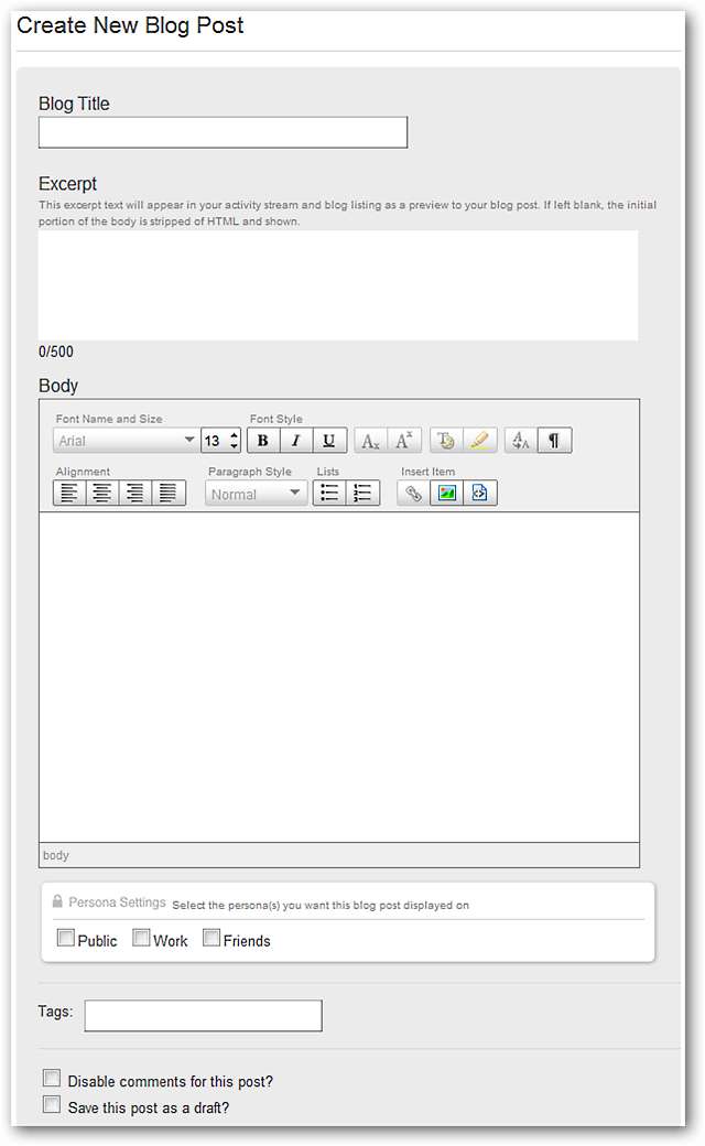 Als u blogberichten aan uw site wilt toevoegen, is dit wat u zult zien. Er is een erg leuke fragmentoptie die je kunt gebruiken om "teasers" voor je berichten te maken ( mooi hoor! ). De postwerkbalk heeft een mooie selectie van beschikbare opdrachten en bevat zelfs superscript- en subscriptopdrachten.