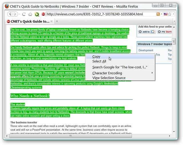 Voor ons voorbeeld hebben we een artikel gekozen met ingesloten koppelingen, vetgedrukte sectiekoppen en verschillende tekstgroottes. Het "Contextmenu" biedt slechts een enkele "Kopieeropdracht" en het lijdt geen twijfel dat de opmaak ook zal worden gekopieerd.