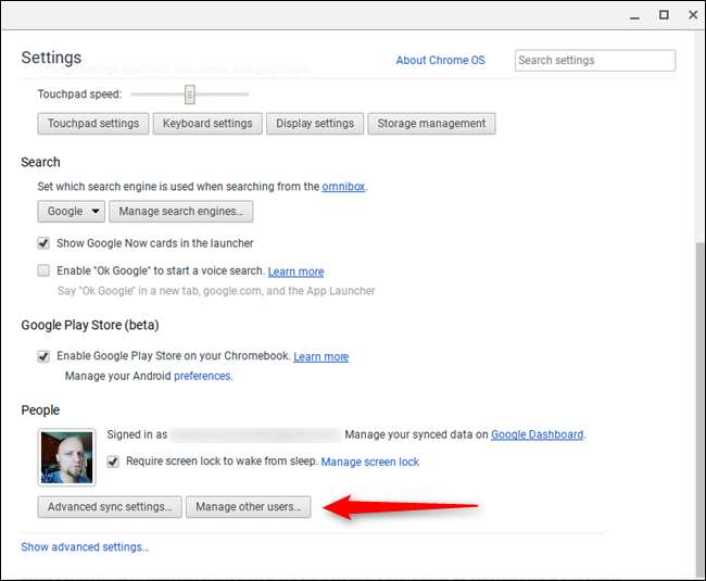 Als u de toegang tot uw Chromebook wilt beperken, opent u het menu Instellingen door op het systeemvak te klikken en het tandwielpictogram te kiezen. Scrol vanaf daar omlaag naar het gedeelte "Mensen" en klik op de knop Andere gebruikers beheren.