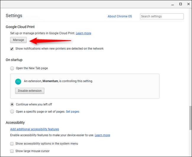 Scroll door dit menu naar het gedeelte "Google Cloud Print" en klik op de knop Beheren.