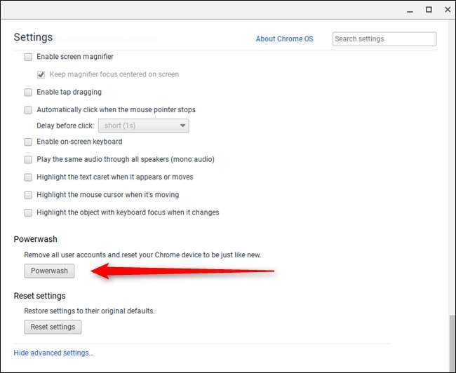 U vindt deze optie op het scherm Instellingen. Klik op de link Geavanceerde instellingen weergeven en scrol omlaag naar beneden, waar u een Powerwash-knop ziet.