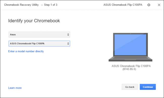 Het herstelprogramma biedt een eenvoudig overzicht wanneer u het start. U moet echter uw exacte Chromebook-model kennen. U kunt het modelnummer van uw Chromebook vinden op het herstelscherm, maar er is ook een link om het model te selecteren in een lijst in het herstelprogramma.