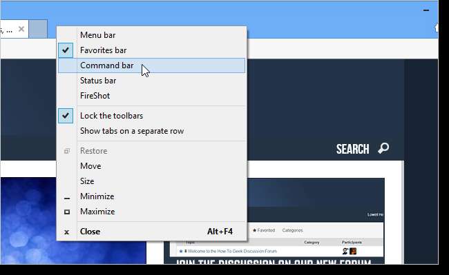 ) is beschikbaar. Open Internet Explorer (we gebruiken versie 10 op het bureaublad in Windows 8). Als u de RSS-knop niet op een zichtbare werkbalk ziet, klikt u met de rechtermuisknop op de tabbladenbalk. Selecteer Commandobalk in het pop-upmenu. Als de opdrachtbalk zichtbaar is, moet de optie in het pop-upmenu worden aangevinkt.