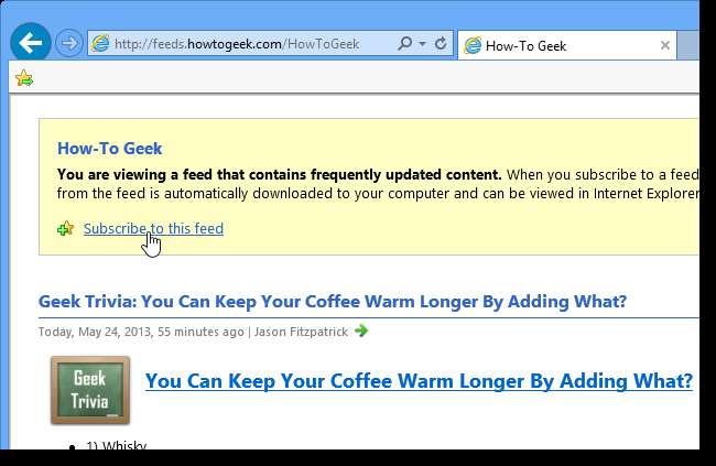 Nu zullen we de RSS-feed voor How-To Geek toevoegen aan de Common Feed List in Internet Explorer. Om dit te doen, moeten we ervoor zorgen dat de werkbalk met de RSS-knop (