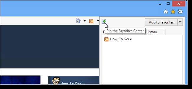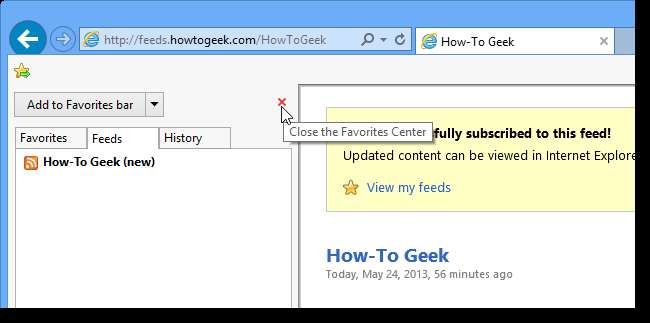Het Favorietencentrum wordt aan de linkerkant van het Internet Explorer-venster weergegeven en de How-To Geek-feed wordt weergegeven op het tabblad Feeds. Om het Favorietencentrum te sluiten, klikt u op de X-knop in de rechterbovenhoek van het paneel.