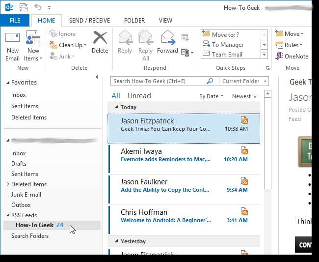 Wanneer u Outlook opent, wordt de How-To Geek-feed weergegeven onder de map RSS-feeds in de lijst met mappen aan de linkerkant. Klik erop om de huidige RSS-feed voor How-To Geek te bekijken.