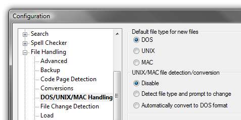 Kies Bestandsafhandeling in het Configuratiedialoogvenster en vervolgens DOS / UNIX / MAC-afhandeling in het menu aan de linkerkant.