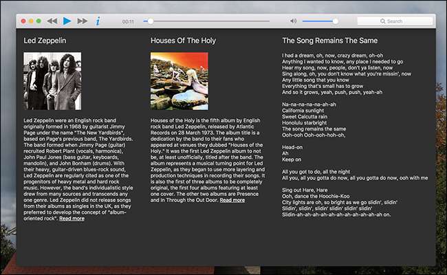 Er is ook een informatiepaneel met wat achtergrondinformatie over de artiest en het album naast de songtekst van het nummer dat momenteel wordt afgespeeld.