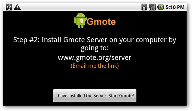 Wanneer u de GMote-app voor het eerst op uw Android-apparaat start, wordt u gevraagd om de Gmote-serversoftware op uw computer te installeren. U vindt de downloadlink aan het einde van dit artikel, of u kunt ervoor kiezen om de link naar uw inbox te laten sturen door (E-mail mij de link) te selecteren.