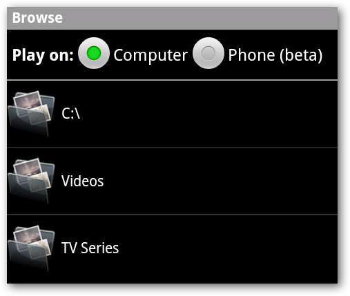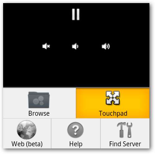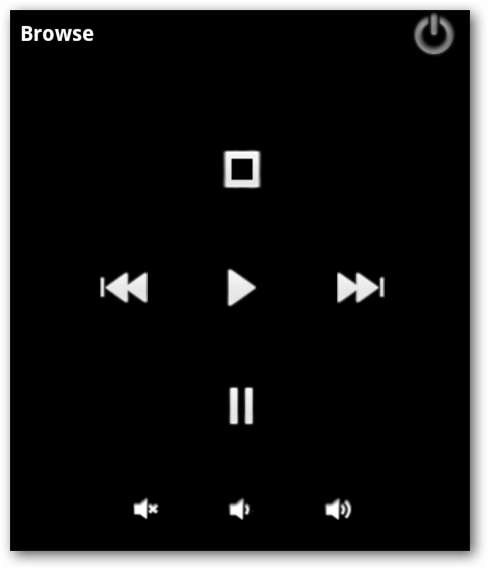 GMote heeft twee schermen die u kunt gebruiken om uw computer te bedienen. Het externe scherm heeft enkele basisbedieningen voor het afspelen van media. Tik op Bladeren linksboven om door alle mediamappen te bladeren die u tijdens de installatie hebt toegevoegd, of tik op het aan / uit-pictogram rechtsboven om de momenteel actieve toepassing op uw computer te sluiten.
