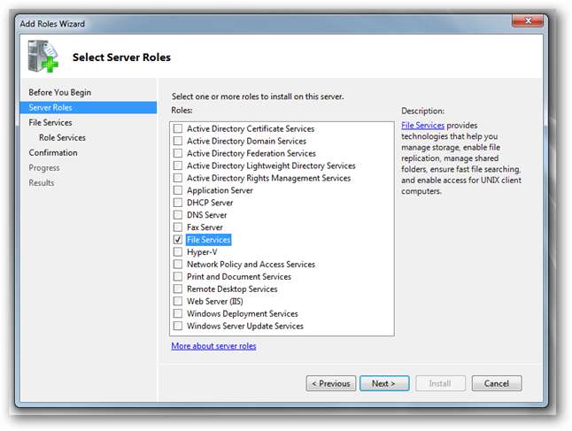 Klik op Volgende op de pagina Voordat u begint om een lijst met beschikbare rollen te openen die kunnen worden geïnstalleerd. Vink de optie Bestandsservices aan en klik op Volgende, klik in het gedeelte Inleiding tot bestandsservices nogmaals op Volgende.
