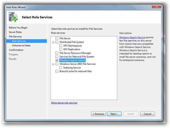 Nu wordt u gevraagd om de Roleservices te kiezen, de enige die u hoeft te selecteren, is de Windows Search-service.